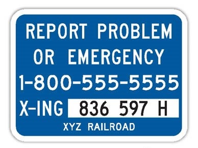 - Report the Blocked Crossing to the Railroad: Contact the railroad using the toll-free number listed on the blue Emergency Notification System (ENS) sign that is posted at the crossing. It will look like the one below.