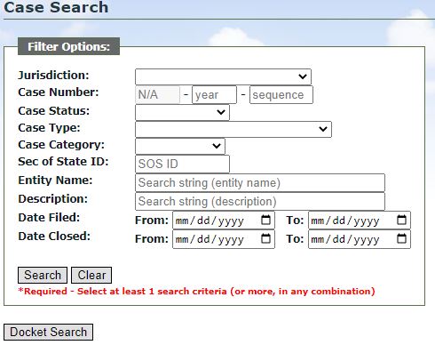 This button navigates to the Docket Search page in one of the two different methods below.- Docket Search (without a search results count) - the docket search displays with no pre-selected search criteria and will search all dockets on all cases.