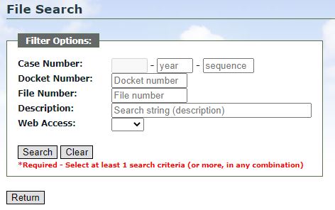 This button navigates to the File Search page in one of the two different methods below.- File Search (without a search results count) - the file search displays with no pre-selected search criteria and will search all files on all dockets of all cases.