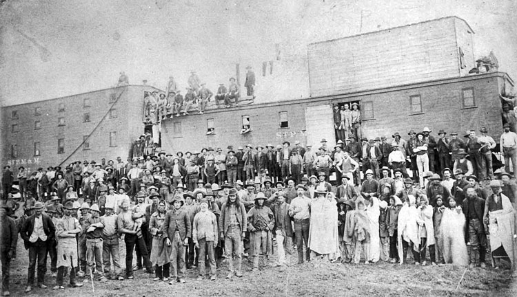 When Our Gang Came Out From Supper was the original caption on this picture. It was taken in Montana Territory in 1887, when construction forces were pushing the St. Paul, Minneapolis and Manitoba Railway westward from Minot, in Dakota Territory, to Great Falls and Helena. The Manitoba was a Great Northern predecessor.